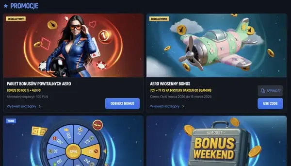 Utrzymujemy aktywne promocje dla regularnej gry, łącząc proste misje z krótkimi ofertami tematycznymi. Aerobet prowadzi Wheel of Fortune w PLN, gdzie kręcisz kołem po nagrody, takie jak punkty lojalnościowe, darmowe spiny, bonusy gotówkowe lub gadżety. Monday Reload oferuje 55% bonusu od dopłaty plus 30 Darmowych Spinów na All-Star Fruits, a Tuesday Bonus zapewnia 50 Darmowych Spinów na Halloween Bonanza. Dla gry rywalizacyjnej Turbo Wins to turniej sieciowy w EUR z dużą pulą nagród.